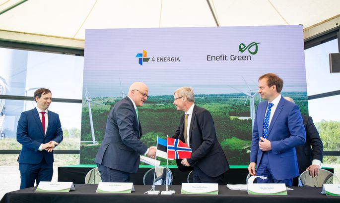 Eesti Energia周二在Paldiski Wind Park與Nelja Energia簽署了一項承諾協議。左起:VeikoRäim,AavoKärmas,Thorleif Leifsen和Hando Sutter