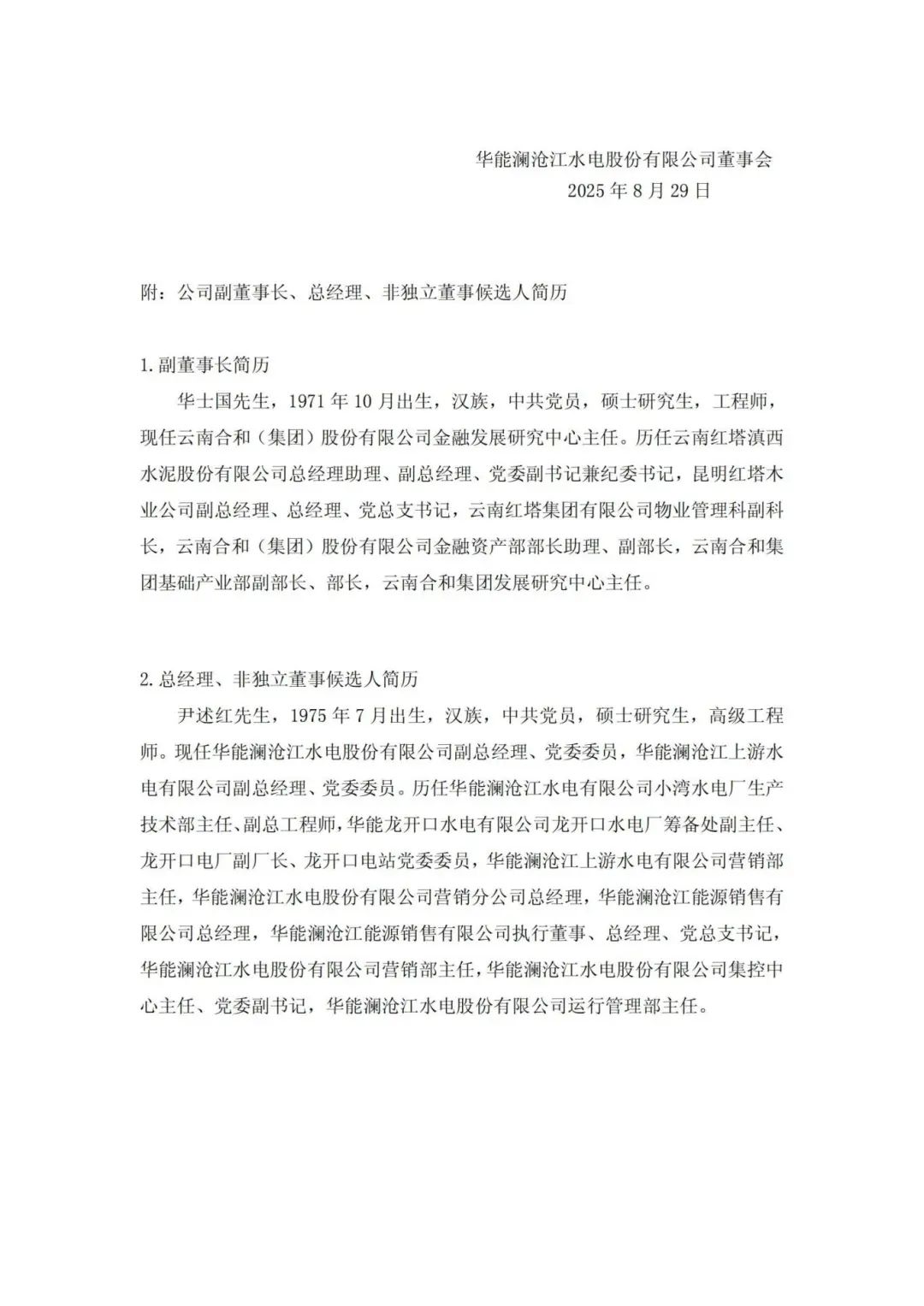 8月28日,華能瀾滄江水電股份有限公司(以下簡稱“華能水電”)公告稱,華能水電于8月28日召開第四屆董事會第十次會議,審議通過了《關于選舉公司副董事長的議案》《關于聘任公司高級管理人員的議案》《關于選舉公司非獨立董事候選人的議案》。