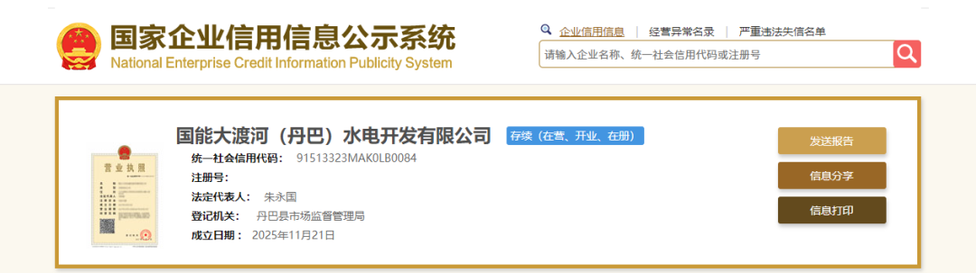 股東及出資信息顯示,該公司由國電電力旗下國能大渡河流域水電開發(fā)有限公司、四川鐵能電力開發(fā)有限公司、寧德時(shí)代新能源科技股份有限公司共同持股。