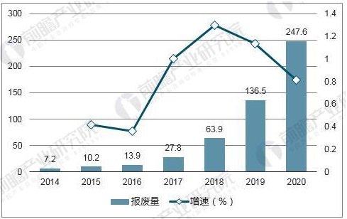 2014-2020年中國動力電池報(bào)廢回收量統(tǒng)計(jì)及增長情況預(yù)測