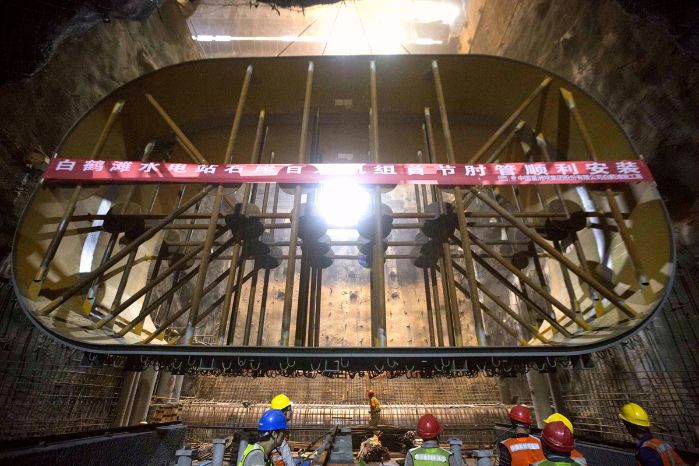 白鶴灘水電站工程右岸共布置有8臺單機容量百萬千瓦的水輪發電機組,每臺水輪機尾水肘管分為13節,單管節最大重量42.8噸,最小重量16.9噸。肘管進水口截面為圓型,直徑9750毫米;出水口為高9165毫米、寬15559毫米的橢圓形截面。最先吊裝的9號機肘管(含內支撐)安裝工程量為337.5噸。
