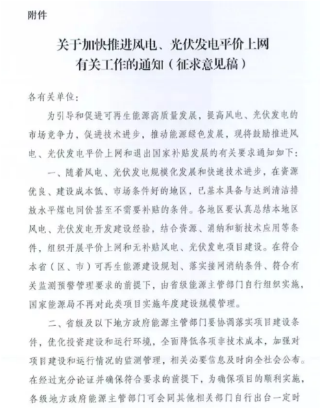 據(jù)獲悉,近日,國(guó)家能源局印發(fā)了《關(guān)于加快推進(jìn)風(fēng)電、光伏發(fā)電平價(jià)上網(wǎng)有關(guān)工作的通知(征求意見(jiàn)稿)》,通知指出,隨著風(fēng)電、光伏發(fā)電規(guī)模化發(fā)展和快速技術(shù)進(jìn)步,在資源優(yōu)良、建設(shè)成本低、市場(chǎng)條件好的地區(qū),已基本具備與達(dá)到清潔排放水平煤電同價(jià)甚至不需要補(bǔ)貼的條件。