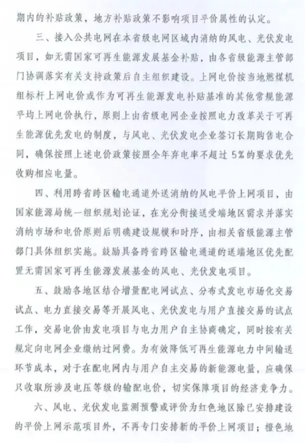 此外,風(fēng)電、光伏發(fā)電監(jiān)測(cè)預(yù)警或評(píng)價(jià)為紅色地區(qū)除已安排建設(shè)的平價(jià)上網(wǎng)示范項(xiàng)目外,不再專(zhuān)門(mén)安排新的平價(jià)上網(wǎng)項(xiàng)目;橙色地區(qū)鼓勵(lì)選取資源條件較好的已核準(zhǔn)(備案)項(xiàng)目開(kāi)展平價(jià)上網(wǎng)工作;綠色地區(qū)在落實(shí)消納條件的基礎(chǔ)上自行開(kāi)展平價(jià)上網(wǎng)項(xiàng)目建設(shè)。