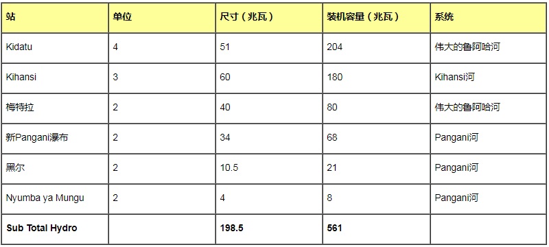 坦桑尼亞還從烏干達(8兆瓦)和贊比亞(5兆瓦)進口電力。有關坦桑尼亞現有水電站的列表,請單擊此處。坦桑尼亞還有約4.7兆瓦私人安裝的微型水電站。