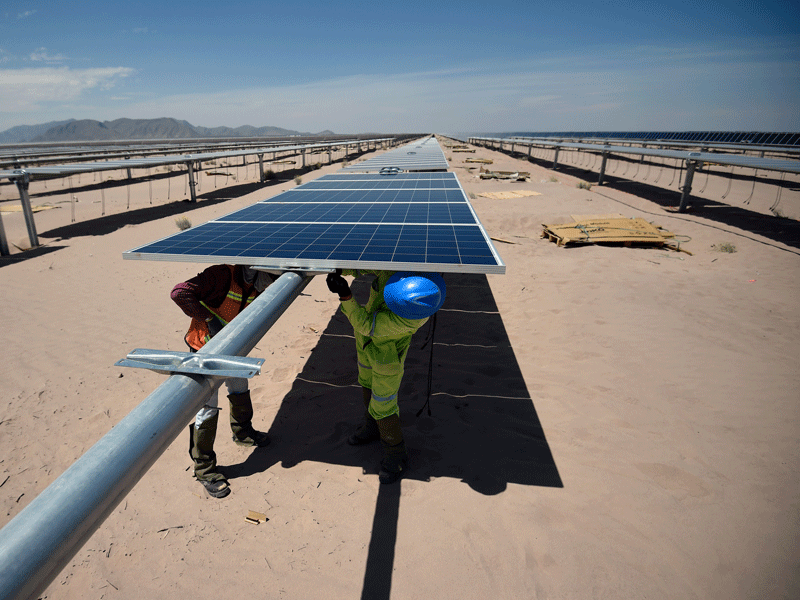 工人們在墨西哥維拉紐瓦附近的維拉紐瓦太陽能光伏電站安裝太陽能電池板。近年來,該國的可再生能源政策已經取得了很大進展