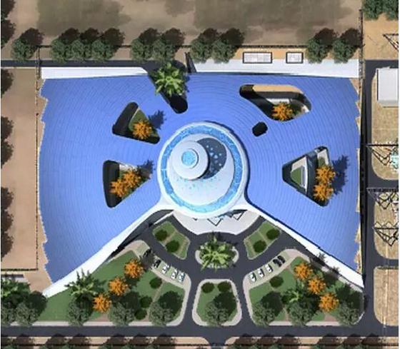 絲路明珠項目以“綠色、生態、節能、健康”為的建筑設計指導理念,以“四節一環保和近零排放”為設計宗旨,集展覽展示、辦公、住宿、生活為一體,表層整體覆蓋光伏板,集中體現先進的節能環保理念、優美的生態環境、豐富的生產管理功能等特色。