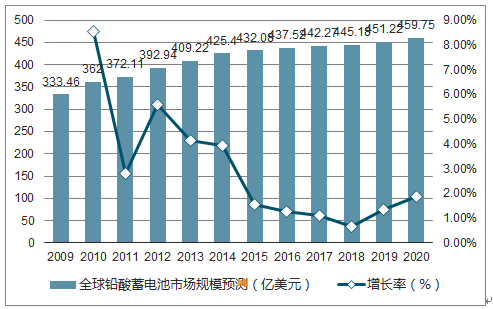 全球鉛酸蓄電池市場(chǎng)規(guī)模預(yù)測(cè)(億美元)