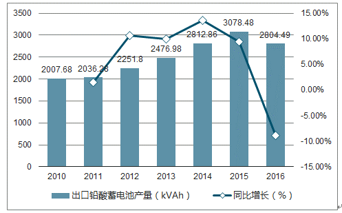 在“十三五”期間鉛酸蓄電池產(chǎn)量預(yù)計(jì)復(fù)合增長(zhǎng)率為 10.76%,至 2020 年鉛酸蓄電池產(chǎn)量達(dá)到 35,000 萬 kVAh。近年來,通過行業(yè)持續(xù)的技術(shù)引進(jìn)、消化、吸收和歐、美、日、韓等國家在我國的投資建廠,我國鉛酸蓄電池主要類產(chǎn)品的制造技術(shù)已經(jīng)接近國際先進(jìn)水平。目前,我國已成為全球鉛酸蓄電池生產(chǎn)、消費(fèi)和出口大國。近年來,我國出口鉛酸蓄電池產(chǎn)量保持較快速度增長(zhǎng),2015 年出口產(chǎn)量為 3,078.48 萬 kVAh,同比增長(zhǎng) 9.44%,2016 年出口產(chǎn)量下滑產(chǎn)量為 2,804.49 萬 kVAh,同比下降 8.90%。