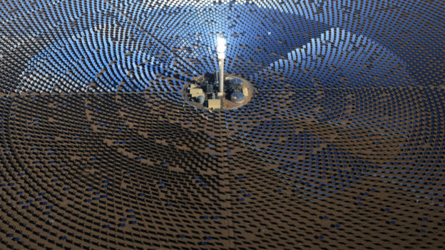 該場(chǎng)域?qū)?huì)鋪滿12,000面鏡子,利用鏡子聚集太陽光至中央220米的高塔,其內(nèi)部熔鹽(moltensalt)將加熱到攝氏565度,并利用熱交換器(heatexchanger)將熱能轉(zhuǎn)移至水中產(chǎn)生蒸氣,可用于蓄熱或是用蒸氣來驅(qū)動(dòng)發(fā)電機(jī)。