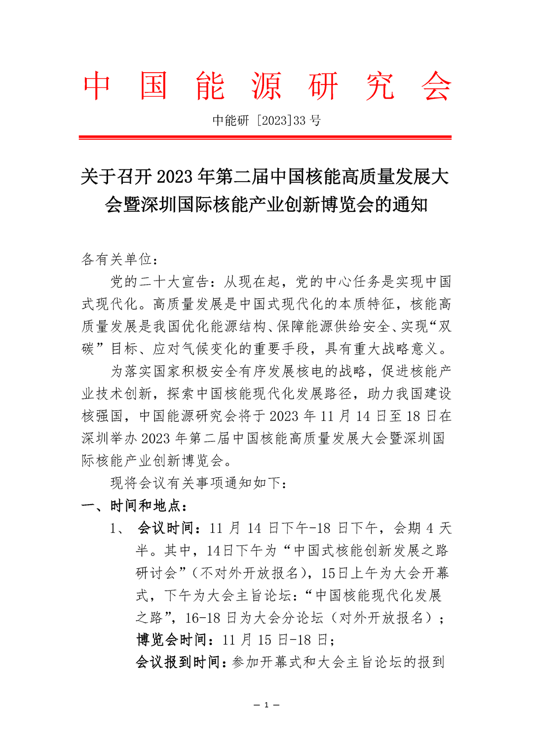 關(guān)于召開(kāi)2023年第二屆中國(guó)核能高質(zhì)量發(fā)展大會(huì)暨深圳國(guó)際核能產(chǎn)業(yè)創(chuàng)新博覽會(huì)的通知