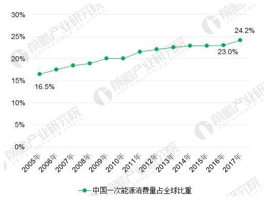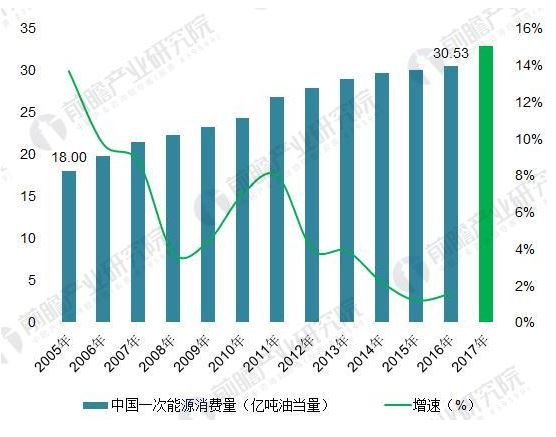 圖表5:2005-2017年中國(guó)大陸一次能源消費(fèi)總量及增速(單位:億噸油當(dāng)量,%)
