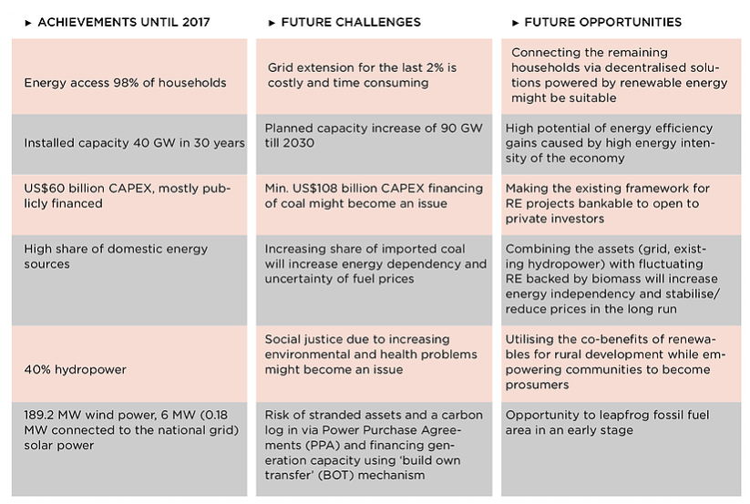 2030年,可再生能源解決方案(不包括大型水電)將只提供高達10%的裝機容量的少量份額。由于溫室氣體排放量較低,越南在理論上有一個跨越式的機會窗口化石燃料投資和體驗相對無痛的過渡。為了避免將國家鎖定在化石燃料結構中的道路,伴隨著越來越多的滯留資產(chǎn)以及更高的能源依賴性,需要政治意愿。為了加速可再生能源的潛力并開始側重于可再生能源的共同效益的社會和公正的能源轉型,需要開發(fā)化石燃料和可再生能源發(fā)電的公平競爭。