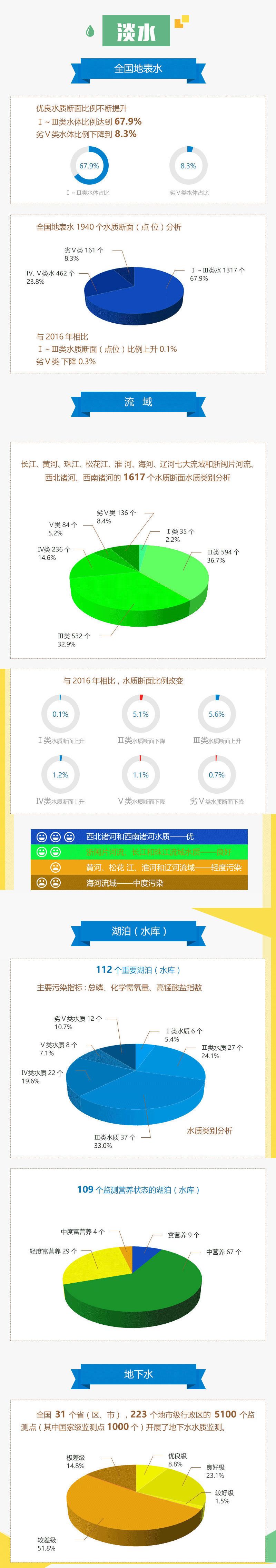 在水環境質量方面,全國地表水1940個國控水質斷面中,優良水質斷面(Ⅰ~Ⅲ類)比例為67.9%,同比增加0.1%。全海域海水符合第一類水質標準的海域面積占中國管轄海域面積的96%。近岸海域水質基本保持穩定,水質級別為一般。